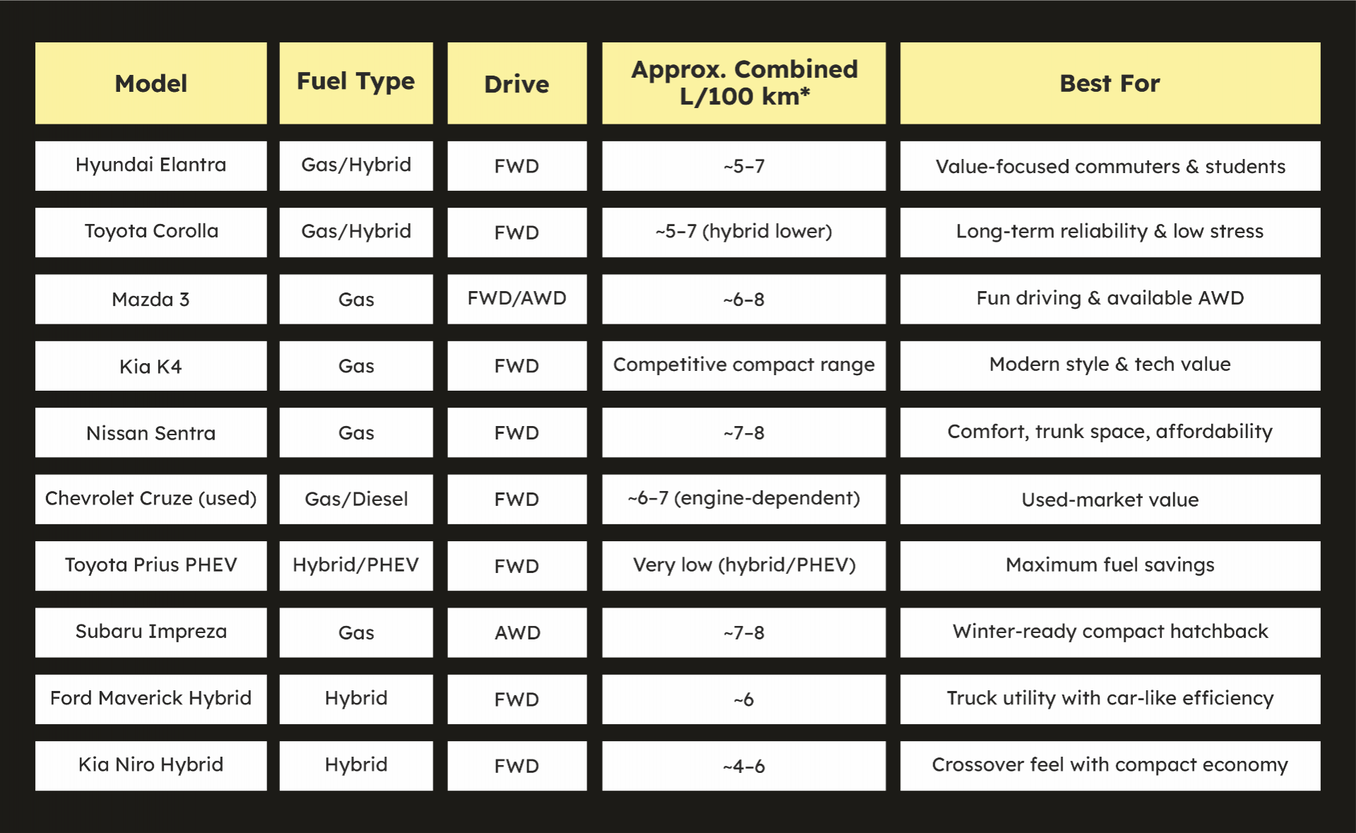 The 10 Best Compact Cars in Canada 2026 offer something for every vehicle driver from efficient favourites like the Toyota Corolla, Hyundai Elantra and Mazda 3, to hybrids such as the Prius and Kia Niro and versatile options like the Ford Maverick Hybrid for those who need extra utility.