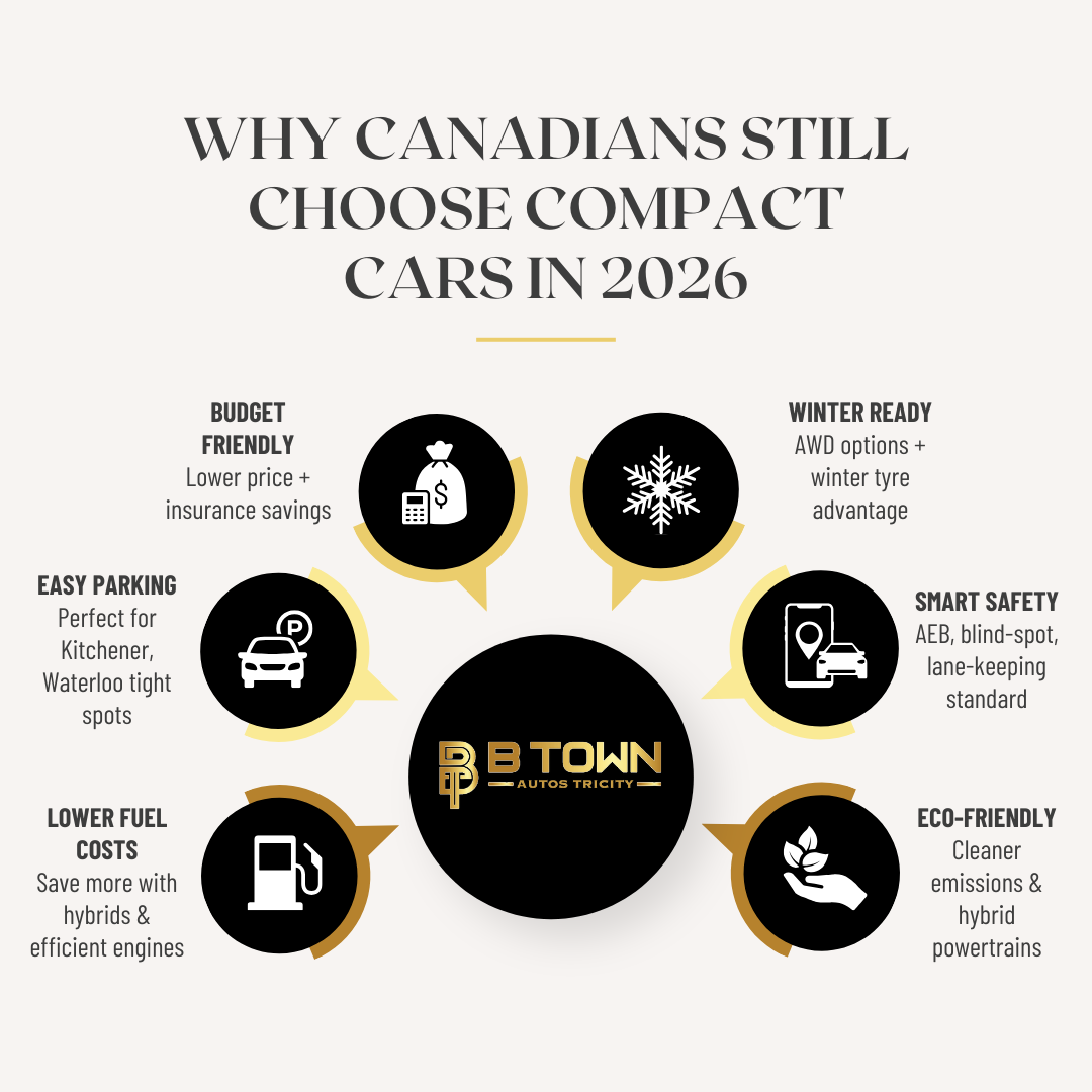 This year’s compact lineup proves you don’t need a big SUV to enjoy advanced safety, great mileage or modern comfort. Whether you're a Waterloo student, a Kitchener commuter or a Cambridge family, today’s small cars offer real value without losing style. If you're asking, “What are the best compact cars Canadians should buy in 2026?” This guide has the latest answers.