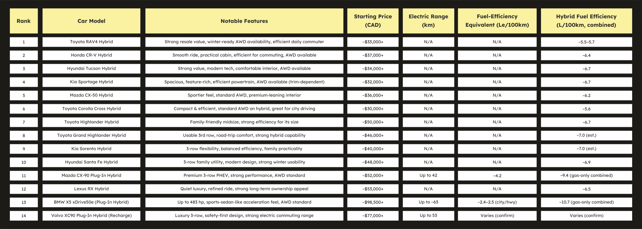If you’re short on time, these are the hybrid SUVs we see Canadian buyers happiest with—based on winter usability, fuel efficiency, reliability trends, and long-term value:
