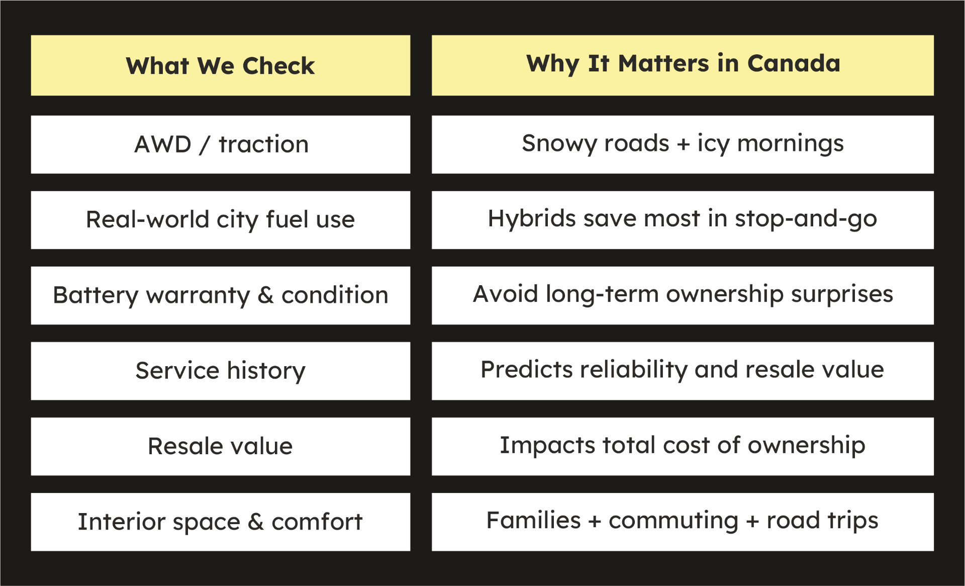 We combine used car dealership inspection experience with ownership trends to identify which hybrid SUVs truly perform well in Canadian conditions.